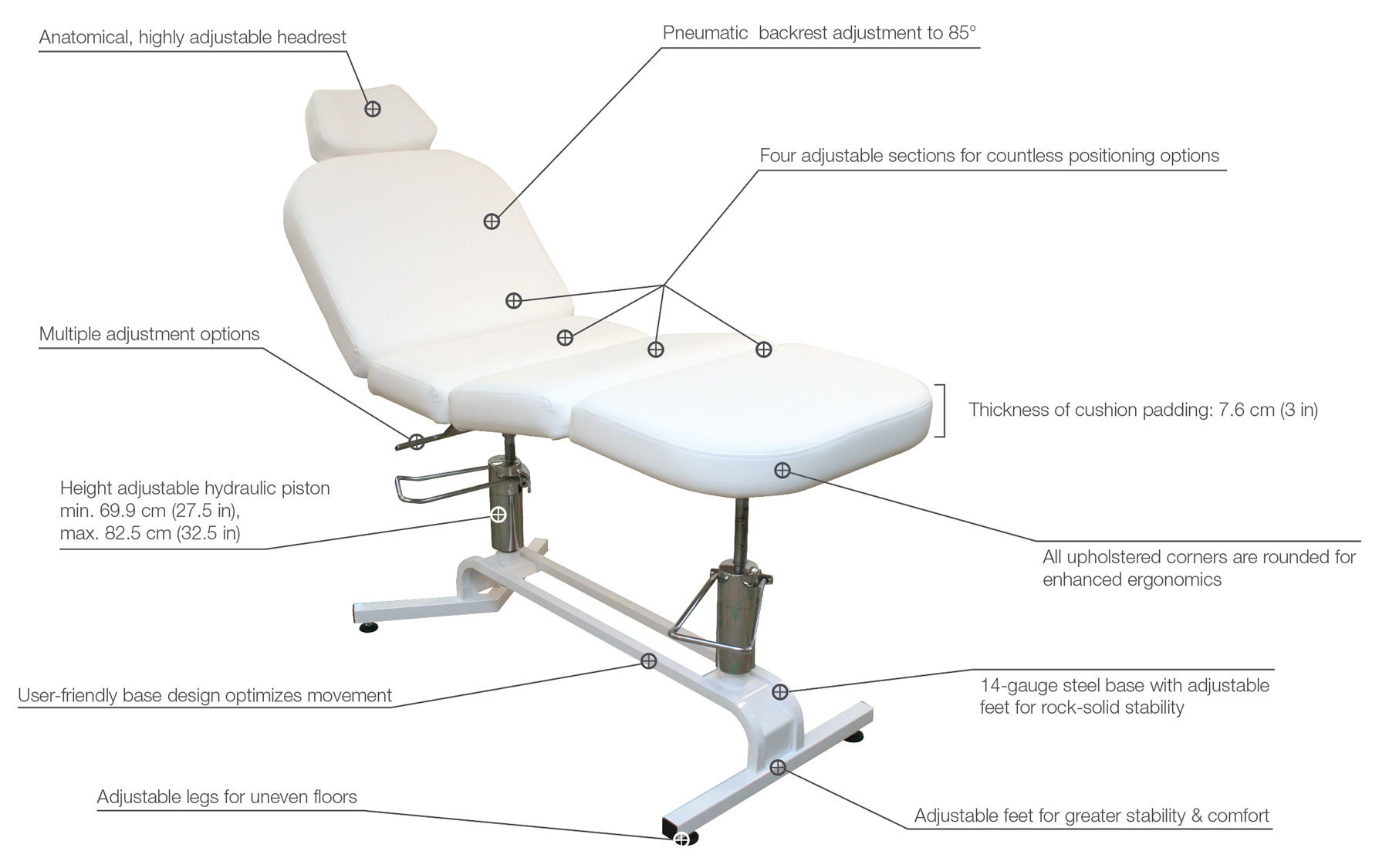 - Height (Hydraulic system) : 69.9 cm (27.5 in) to 82.5 cm (32.5 in)